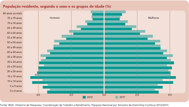 A população é geralmente agrupada em três faixas etárias The changing age distribution of the brazilian. A divisão populacional de um determinado local conforme a faixa etária, ocorre da seguinte forma: Características gerais da população compreende as informações sobre tamanho e estrutura (por idade e sexo), cor ou raça, distribuição da população, densidade e urbanização. População residente do sexo feminino: